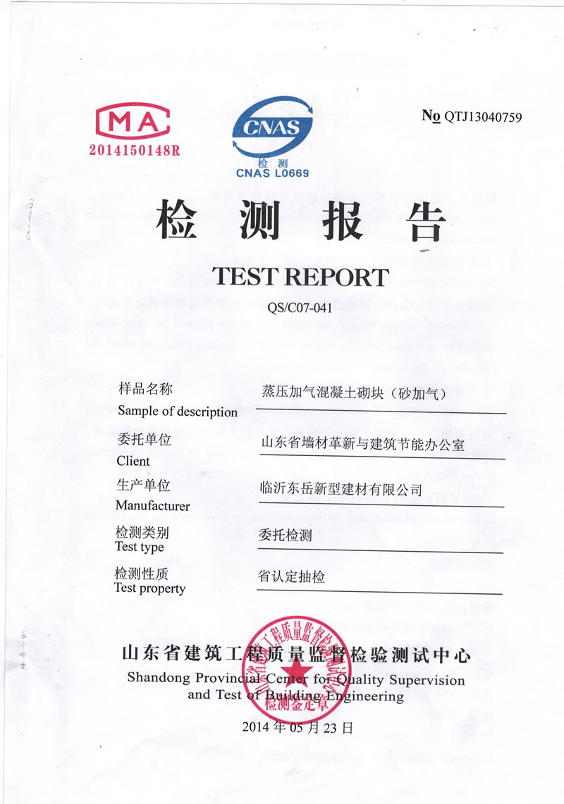 蒸壓加氣混凝土砌塊(砂加氣)檢測(cè)報(bào)告